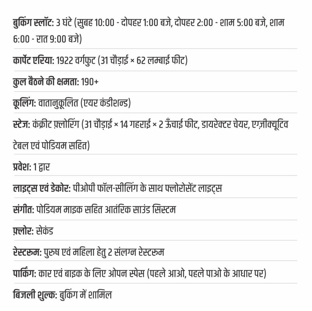 VHSS सांस्कृतिक एवं कन्वेंशन सेंटर नागपुर के मध्य क्षेत्र में स्थित, मधुरम एक सुव्यवस्थित हॉल है, जो मध्यम आकार के आयोजनों के लिए संपूर्ण है. 190 से अधिक बैठने की क्षमता के साथ यह सेमिनार, कार्यशालाओं, सांस्कृतिक कार्यक्रमों, बैठकों एवं प्रदर्शनियों के लिए उपयुक्त है. सुविचारित सुविधाएँ और आसान पहुँच मधुरम हॉल को व्यावसायिक एवं सामाजिक आयोजनों के लिए एक व्यावहारिक और आरामदायक विकल्प बनाती हैं.
